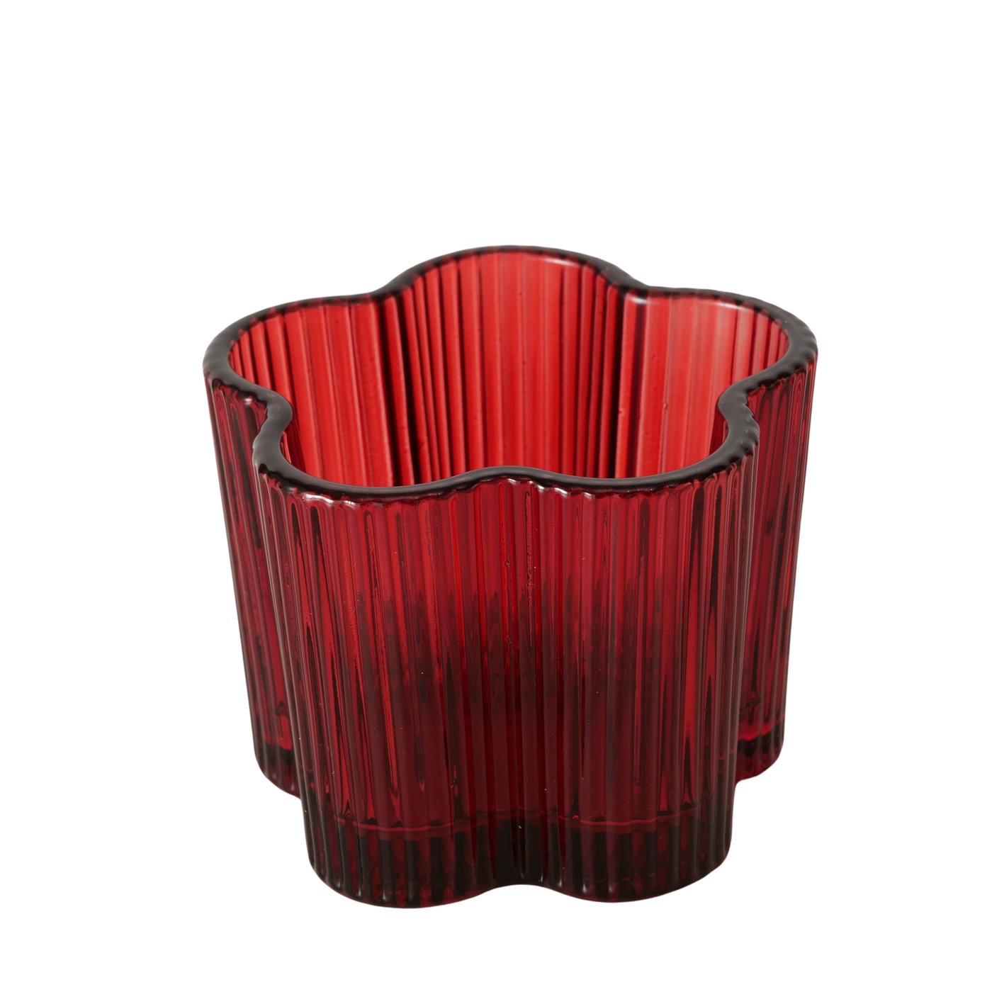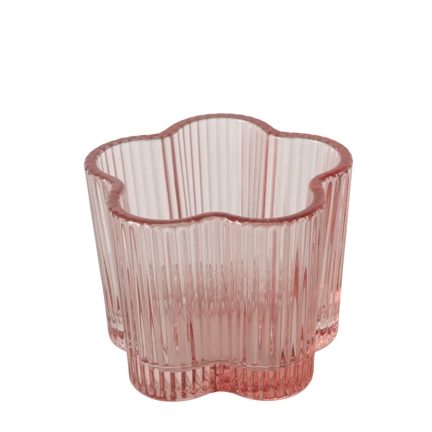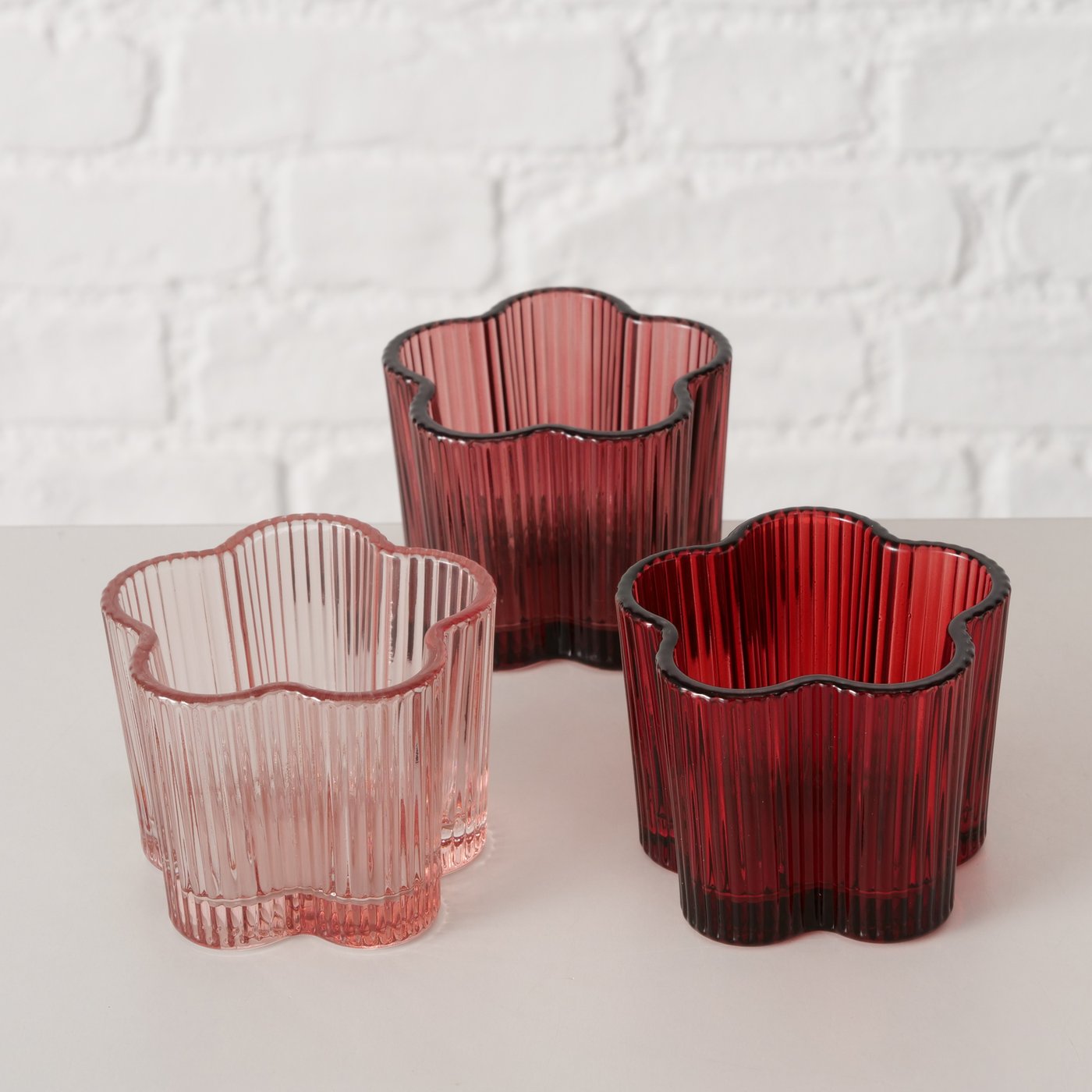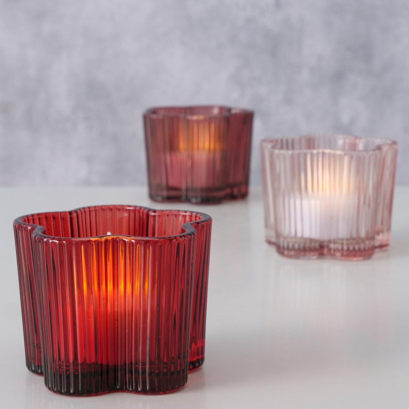 Dieser Teelichthalter wurde aus Glas gefertigt und mit einer Lackierung in Hellrosa und Rot versehen. Das Relief-Design in Form einer Blume sorgt für einen glänzenden optischen Effekt. Mit einer Größe von 7,6 x 6 cm kann er freistehend oder auf dem Tisch platziert werden.