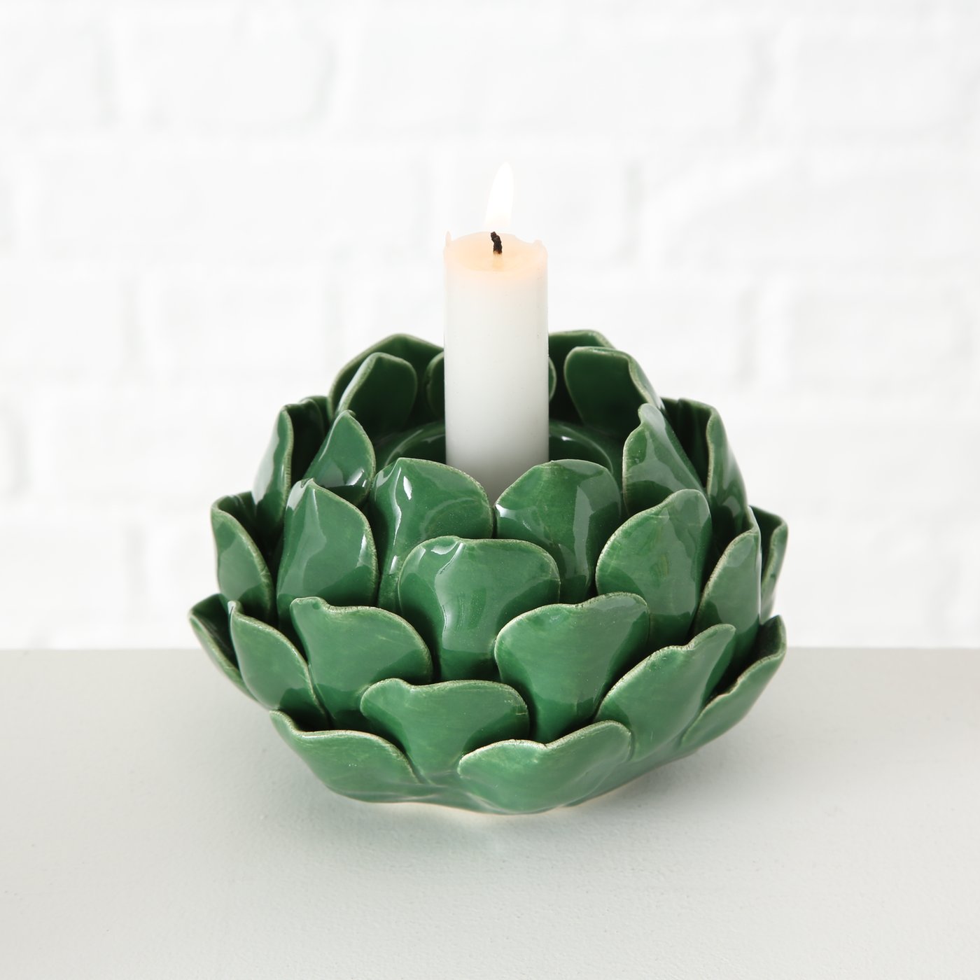Dieser handgearbeitete Teelichthalter Maleva in Form einer Blume bringt mit seinem einfarbigen, hellgrünen und grünen Design eine angenehme Atmosphäre in jeden Raum. Aus Steingut gefertigt, ist er langlebig und robust. Mit einer Höhe von 9 cm und einem Durchmesser von 14 cm bietet er ausreichend Platz für Teelichter. Genießen Sie entspannte Stunden bei Kerzenschein.